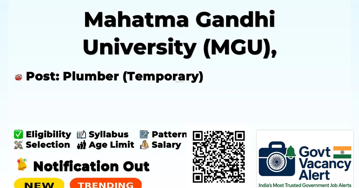Mahatma Gandhi University (MGU) Recruitment 2026 posts of Plumber. Candidates with 10th, ITI attend the walkin. The Walk-in on 19-02-2026. For detailed information please visit MGU official website, mgu.ac.in.