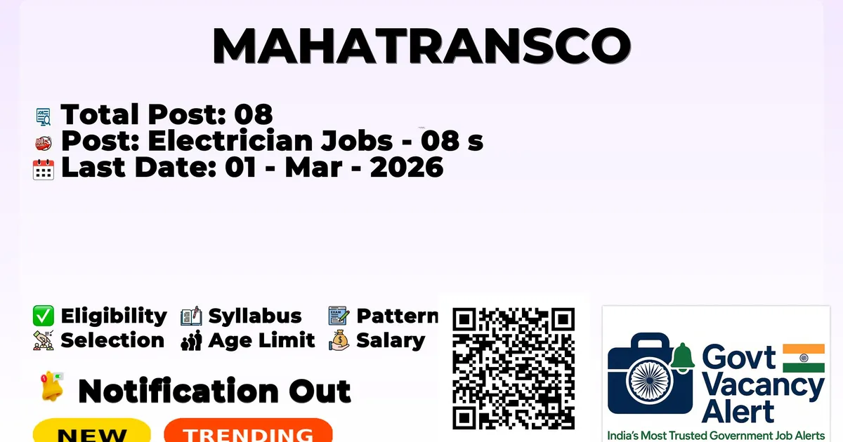 Maharashtra State Electricity Transmission Company (MAHATRANSCO) has officially released a notification for the recruitment of 08 Electrician Apprentice Posts. Those candidates who have qualified in the ITI can grab this chance and apply for the MAHATRANSCO Recruitment 2026. Here, we include the age limit, selection process, and salary structure, education details, application fee, and how to apply for these posts. Interested candidates can apply before the last date of application.