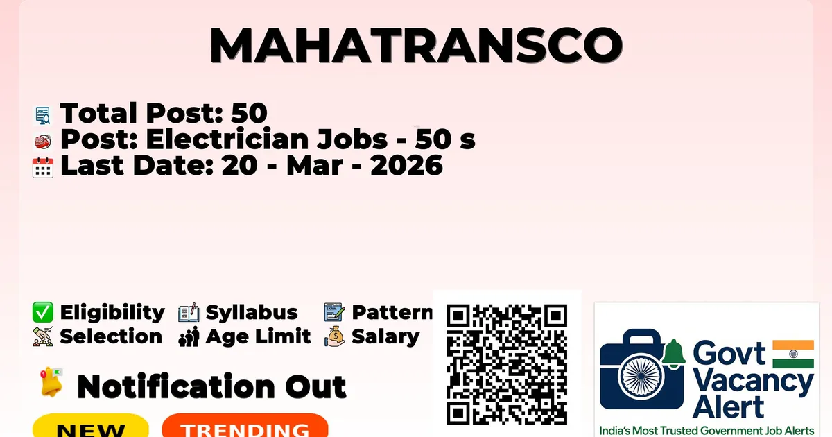 Maharashtra State Electricity Transmission Company (MAHATRANSCO) has declared the official notification for 2026. To fill up the 50 vacancies for Electrician Jobs. Those candidates who have qualified in the 10th Pass, ITI can grab this chance and apply for the MAHATRANSCO Notification 2026. Here, we include the age limit, selection process, salary structure, education details, application fee, and how to apply for these posts. Interested candidates can apply online before the last date of application.