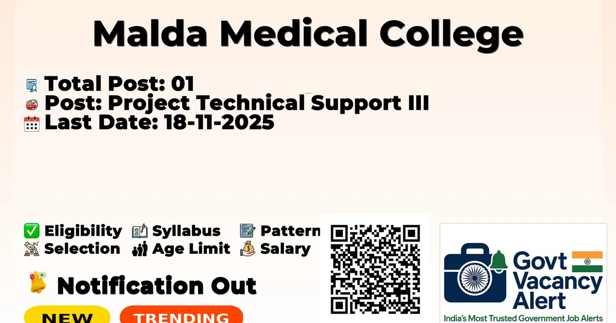 Malda Medical College has released an official notification for the recruitment of 01 Project Technical Support III Posts. Interested and eligible candidates can apply Offline through the official Malda Medical College website. The last date to submit the application form is 18-11-2025. In this article, you’ll find the Malda Medical College Project Technical Support III Posts recruitment details, including eligibility criteria, age limit, salary structure, selection process, application steps, and direct links to the official notification and Offline application form. Join Arattai Channel Trending Govt Jobs SAIL 124 Management Trainee (Tech) Online Form 2025 KVS and NVS Online Form 2025 RRB NTPC 5,810 Online Form 2025 Bank of Baroda 2700 Apprentices Online Form 2025 Intelligence Bureau (IB) ACIO II Tech Online Form 2025 Advertisement Company Name Malda Medical College Post Name Project Technical Support III No of Posts 01 Salary Rs 28000/- Qualification B.Sc, M.Sc, MPH Age Limit 21 to 40 years Start Date for Apply 10-11-2025 Last Date for Apply 18-11-2025 Official Website malda.gov.in B.Sc nursing or microbiology + Three years' experience in the field or M.Sc nursing or microbiology or Masters in public health Minimum Age Limit: 21 Years Maximum Age limit: 40 Years Age relaxation is applicable as per rules. Starting Date for Apply: 10-11-2025 Last Date for Apply: 18-11-2025 Shortlisted candidates based on their CV shall be called for a written test followed by interview of eligible candidates. The candidates should come with all original documents along with one photocopy set and valid photo ID at the time of interview.