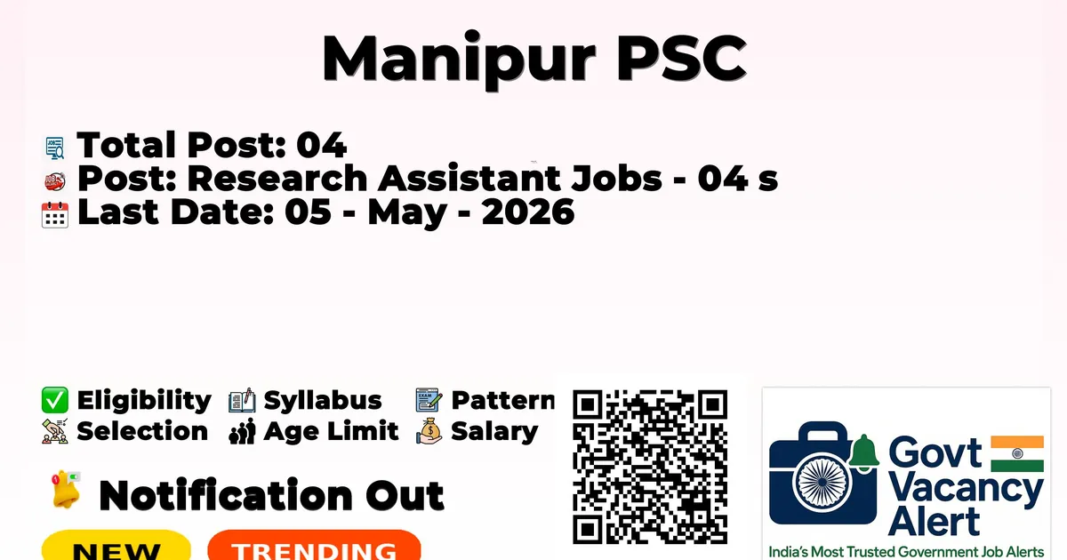 The Manipur Public Service Commission (Manipur PSC) has officially released the notification to fill the vacancies of 04 Research Assistant Posts. Interested and eligibile candidates can use this opportunity to apply for these posts before the last date of application. Candidates who have completed any degree can apply for the Manipur PSC Jobs 2026. The interested applicants can apply in online mode. Here we have mentioned the education details, age limit, selection process, application fee, salary, and how to apply for these posts before the deadline. The application dates have already begun.