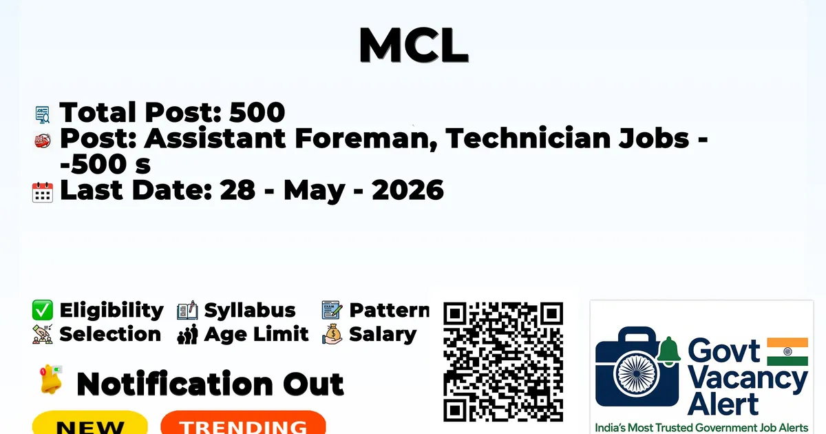 The Mahanadi Coalfields Limited (MCL) has officially released the notification to fill the vacancies of 500 Assistant Foreman and Technician Jobs. Interested and eligibile candidates can use this opportunity to apply for these posts before the last date of application. Candidates who have completed their Diploma in Electrical Engineering, 10th, and ITI can apply for the MCL Notification 2026. The interested applicants can apply in online mode. Here we have mentioned the education details, age limit, selection process, application fee, salary, and how to apply for these posts before the deadline. The application dates have already begun.