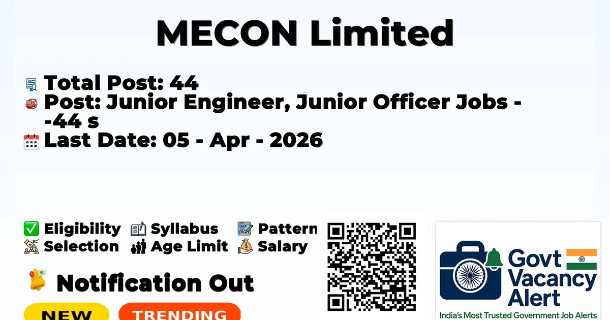 The Metallurgical and Engineering Consultants (MECON) has officially released the notification to fill the vacancies of 44 Junior Engineer and Junior Officer Jobs. Interested and eligibile candidates can use this opportunity to apply for these posts before the last date of application. Candidates who have completed their Any Degree, Diploma in Mechanical, Electrical, Electronics, Civil Engineering can apply for the MECON Notification 2026. The interested applicants can apply in online mode. Here we have mentioned the education details, age limit, selection process, application fee, salary, and how to apply for these posts before the deadline. The application dates have already begun.