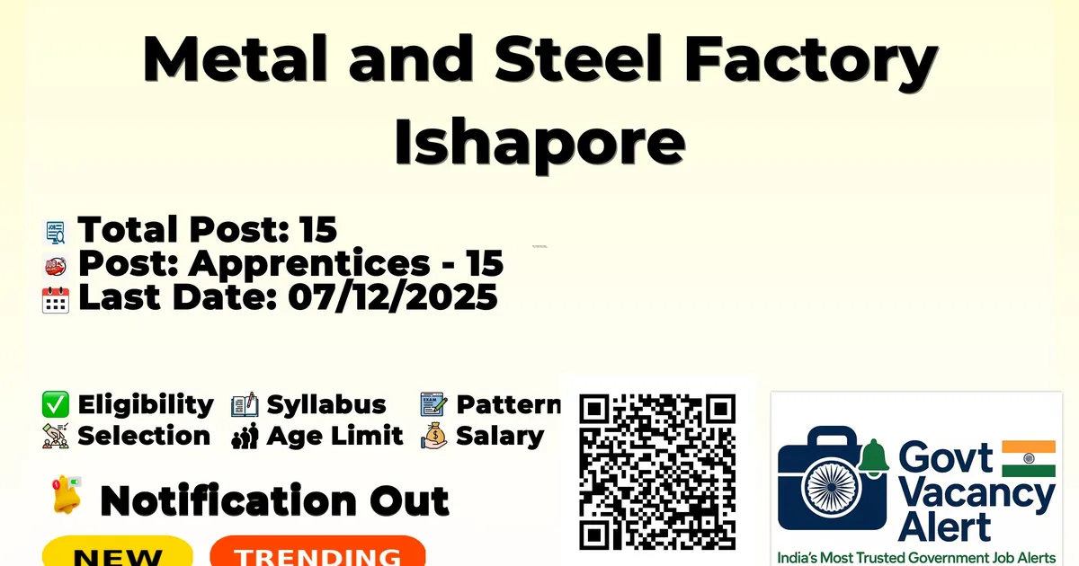 Metal and Steel Factory Ishapore Job Vacancy 2025-26 for 15 Apprentices: Under the Skill India Mission of the Government of India, this establishment is in the process of engaging Graduate Apprentices and Diploma/Technician Apprentices for one year of apprenticeship training under the Apprentices Act, 1961, and its amendments. This training will take place at Metal and Steel Factory, Ishapore (West Bengal), a unit under Yantra India Limited (A Government of India Enterprise), in various disciplines through the Government of India NATS Portal. Post Name No of Posts Graduate Apprentices 06 Diploma / Technician Apprentices 09 ✔️ Graduate Apprentices: Mechanical - 02, Electrical - 02, Metallurgical - 02. ✔️ Diploma / Technician Apprentices: Mechanical - 03, Electrical - 03, Metallurgical - 03. ✔️ For Diploma Holders: Between 18 to 22 years as on closing date. ✔️ For Graduates: Between 21 to 25 years as on closing date. ✔️ The Upper age relaxation - 05 years for SC / ST, 03 years for OBC (NCL) and 10 years for PwD. ✔️ Graduate Apprentices: ₹ 10900/- per month. ✔️ Diploma / Technician Apprentices: ₹ 12300/- per month. ✔️ Graduate Apprentices: B.E. / B.Tech Engineering Graduate in relevant discipline. ✔️ Diploma / Technician Apprentices: Diploma in relevant engineering discipline. Selection will be based on the merit list and vacancy positions advertised. Final merit lists will be prepared considering reservation breakup, if any, in descending order of percentage of marks obtained by the candidates in the respective field in graduate or diploma courses. Shortlisted candidates, as per vacancies listed, will be called for document verification. In case of two candidates having the same marks, the older candidate will be preferred. If dates of birth are also the same, the candidate who passed the respective Graduate or Diploma Examination earlier will be considered first. Even if the years of passing the respective Graduate or Diploma Examination are the same, the candidate's name appearing first alphabetically will be considered first. Candidates finally enlisted in the provisional select list will be subject to a satisfactory police verification report including verification of educational qualification as well as a medical examination. No Fee shall be charged from the candidates applying for Graduate / Diploma Apprenticeship Training. ➢ Eligible candidates must register themselves in NATS Portal and then apply for Graduate / Diploma Apprentices through NATS Web Portal. ➢ Candidates are advised to indicate their active mobile number and valid e-mail ID in the online application and keep them active during the entire engagement process as all important messages will be sent by email/SMS. ➢ Original Caste Certificate (SC/ST/OBC), for OBC (Non-Creamy Layer Certificate) and Physical Disability Certificate, in case of PH/PWD shall be produced by the candidate at the time of document verification. ➢ Provisionally selected candidates having Aadhaar Card shall have to produce original Aadhaar card or the documents, uploaded during the time of registration in NATS portal, at the time of document verification. Detailed Notification Apply Online Link Latest Apprentice Jobs Opening date for Notification 08/11/2025 Last date for submission of online application will be 01 month (07/12/2025) Tentative date of Merit List to be notified