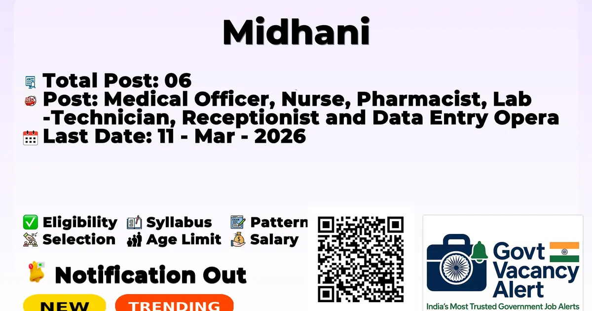 The Mishra Dhatu Nigam Limited (MIDHNI) has officially released the notification to fill the vacancies of 06 Medical Officer, Nurse, Pharmacist, Lab Technician, Receptionist, and Data Entry Operator Jobs. Interested and eligibile candidates can use this opportunity to apply for these posts before the last date of application. Candidates who have completed their MBBS, B. Pharm, D. Pharm, B.Sc Nursing, GNM, 12th, DMLT, Diploma, or any degree can apply for the MIDHANI Notification 2026. Here we have mentioned the education details, age limit, selection process, application fee, salary, and how to apply for these posts before the deadline. The application dates have already begun.