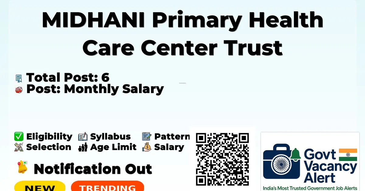 Company Name MIDHANI Primary Health Care Center Trust Post Name Medical Officer, Nurse (Incharge), Junior Nurse, Pharmacist, Lab Technician, Receptionist cum Data Entry Operator No of Posts 6 Advertisement No MPHCC/1/2026 Salary Rs. 60,720/- (Medical Officer), Rs. 33,250/- (Nurse Incharge), Rs. 29,040/- (Junior Nurse), Rs. 29,040/- (Pharmacist), Rs. 29,040/- (Lab Technician), Rs. 29,040/- (Receptionist cum Data Entry Operator) Qualification Graduate with relevant specialization Age Limit Medical Officer: 65 years, Nurse (Incharge): 35 years, Junior Nurse: 30 years, Pharmacist: 35 years, Lab Technician: 35 years, Receptionist cum Data Entry Operator: 35 years Notification Date 18 February 2026 Walk-in Date 05 March 2026 to 11 March 2026 Apply Mode Walk-in Job Type Contract