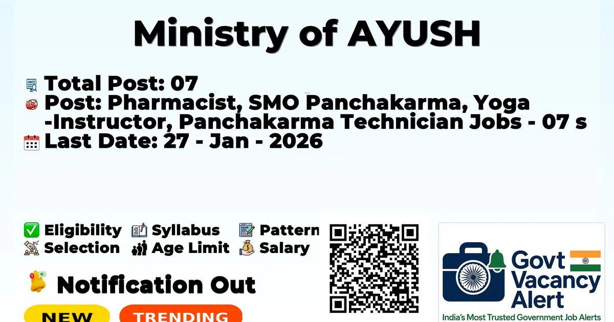 Ministry of AYUSH — Pharmacist, SMO Panchakarma, Yoga Instructor, Panchakarma Technician Jobs - 07 Posts