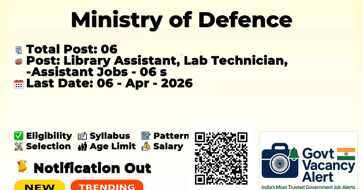 Ministry of Defence — Library Assistant, Lab Technician, Assistant Jobs - 06 Posts