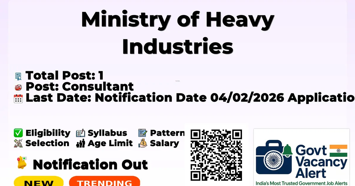 Ministry of Heavy Industries has released an official notification for the recruitment of 01 Consultant Posts. Interested and eligible candidates can apply Online through the official Ministry of Heavy Industries website. The last date to submit the application form is 18-02-2026. In this article, you’ll find the Ministry of Heavy Industries Consultant Posts recruitment details, including eligibility criteria, age limit, salary structure, selection process, application steps, and direct links to the official notification and Online application form.