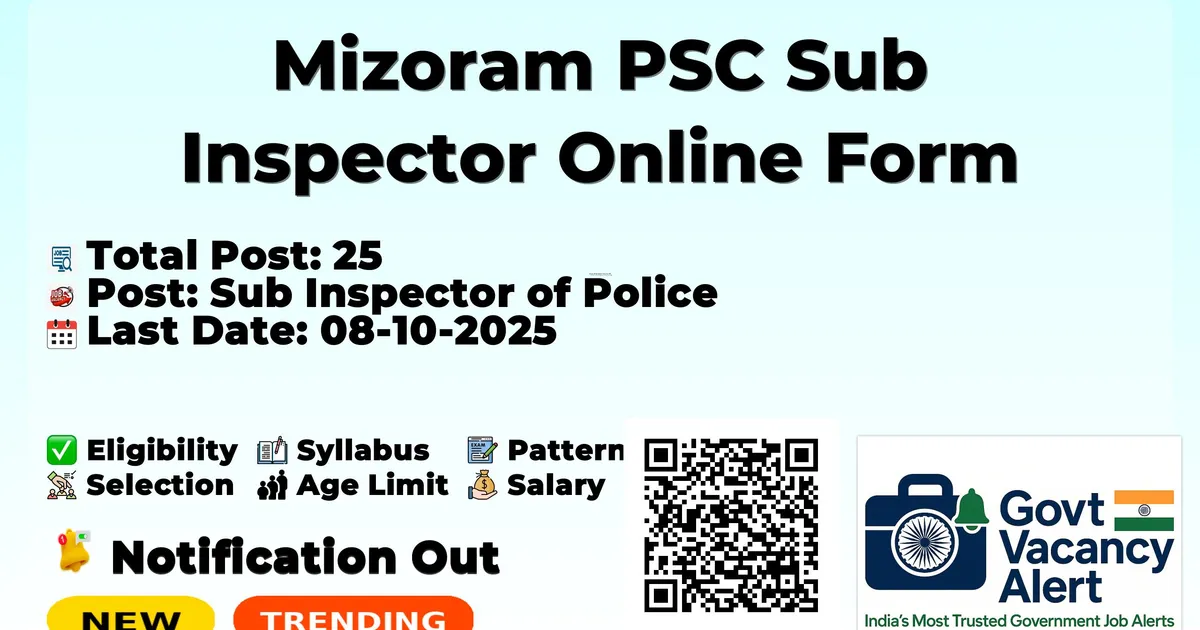 The Mizoram Public Service Commission (Mizoram PSC) Recruitment 2025 for 25 posts of Sub Inspector. Candidates with Any Graduate Can Apply Online. The online application opens on 09-09-2025, and closes on 08-10-2025. The candidate shall apply online through Mizoram PSC website, mizoram.gov.in.