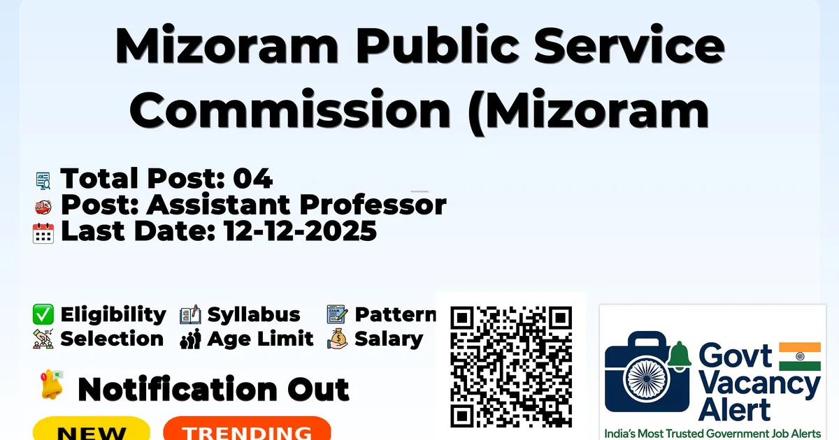 Mizoram Public Service Commission (Mizoram PSC) has released an official notification for the recruitment of 04 Assistant Professor Posts. Interested and eligible candidates can apply Online through the official Mizoram PSC website. The last date to submit the application form is 12-12-2025. In this article, you’ll find the Mizoram PSC Assistant Professor Posts recruitment details, including eligibility criteria, age limit, salary structure, selection process, application steps, and direct links to the official notification and Online application form.