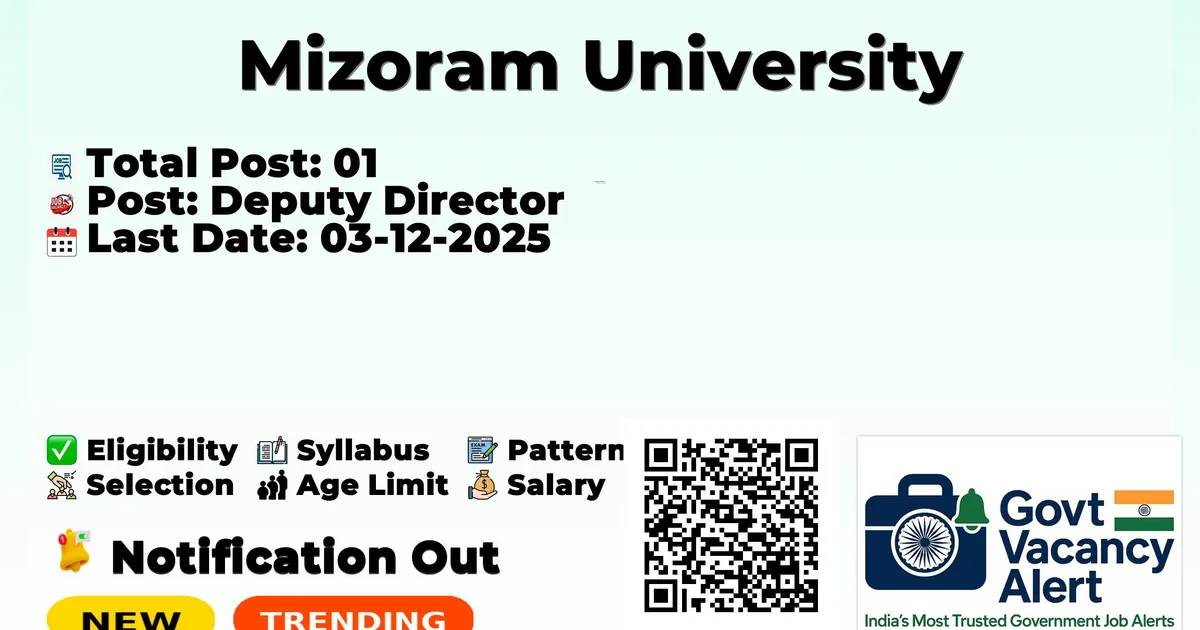 Mizoram University has released an official notification for the recruitment of 01 Deputy Director Posts. Interested and eligible candidates can apply Online through the official Mizoram University website. The last date to submit the application form is 03-12-2025. In this article, you’ll find the Mizoram University Deputy Director Posts recruitment details, including eligibility criteria, age limit, salary structure, selection process, application steps, and direct links to the official notification and Online application form.