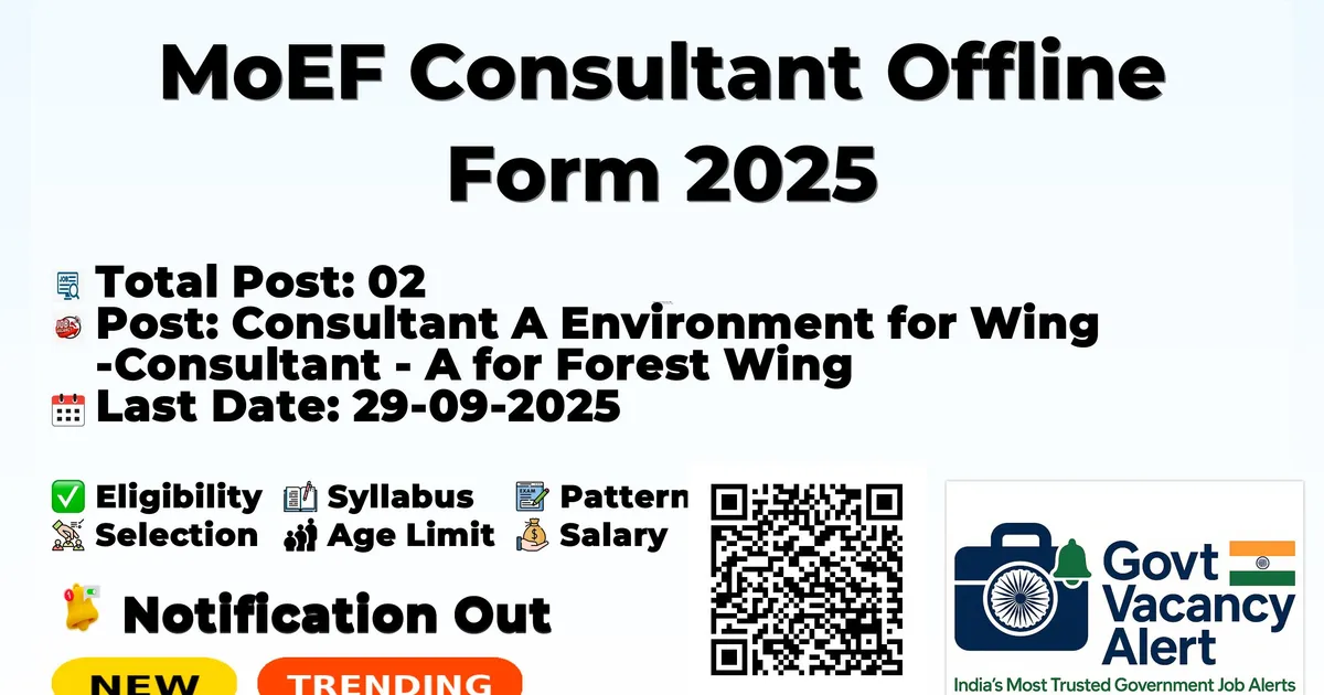 The Ministry Of Environment, Forest and Climate Change (MoEF) Recruitment 2025 for 02 posts of Consultant. Candidates with B.Tech/B.E, M.Sc Can Apply Offline. The Offline application opens on 09-09-2025, and closes on 29-09-2025. The candidate shall apply Offline through MoEF website, moef.gov.in.