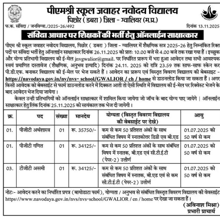 Fill the form before the last date of NVS Gwalior Recruitment ends, otherwise there may be a problem of server down.