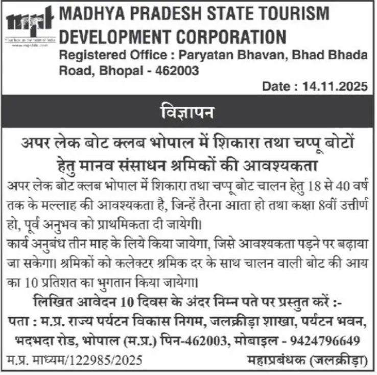 - Required for operating Shikara and oar boats at Upper Lake Boat Club Bhopal.