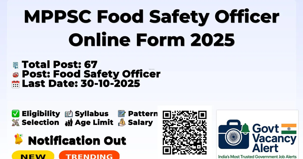The Madhya Pradesh Public Service Commission (MPPSC) Recruitment 2025 for 67 posts of Food Safety Officer. Candidates with B.Sc, B.Tech/B.E, BVSC, M.Sc, M.E/M.Tech, M.Phil/Ph.D Can Apply Online. The online application opens on 12-09-2025, and closes on 30-10-2025. The candidate shall apply online through MPPSC website, mppsc.mp.gov.in.