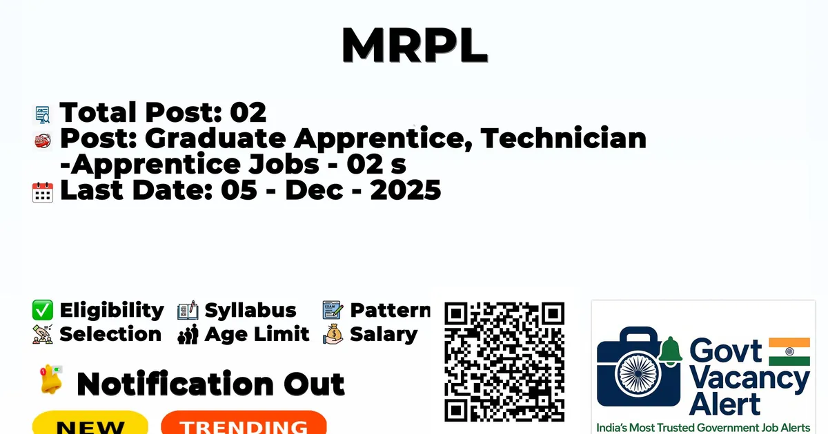 The Mangalore Refinery And Petrochemicals (MRPL) has officially released the notification to fill the vacancies of 02 Graduate Apprentice, Technician Apprentice Jobs. Interested and eligibile candidates can use this opportunity to apply for these posts before the last date of application. Candidates who have completed their B.E./B. Tech in Civil, Electric, and Mechanical Engineering, and Diploma holders can apply for the MRPL Notification 2025. The interested applicants can attend the walk-in interview. Here we have mentioned the education details, age limit, selection process, application fee, salary, and how to apply for these posts before the deadline. The application dates have already begun.