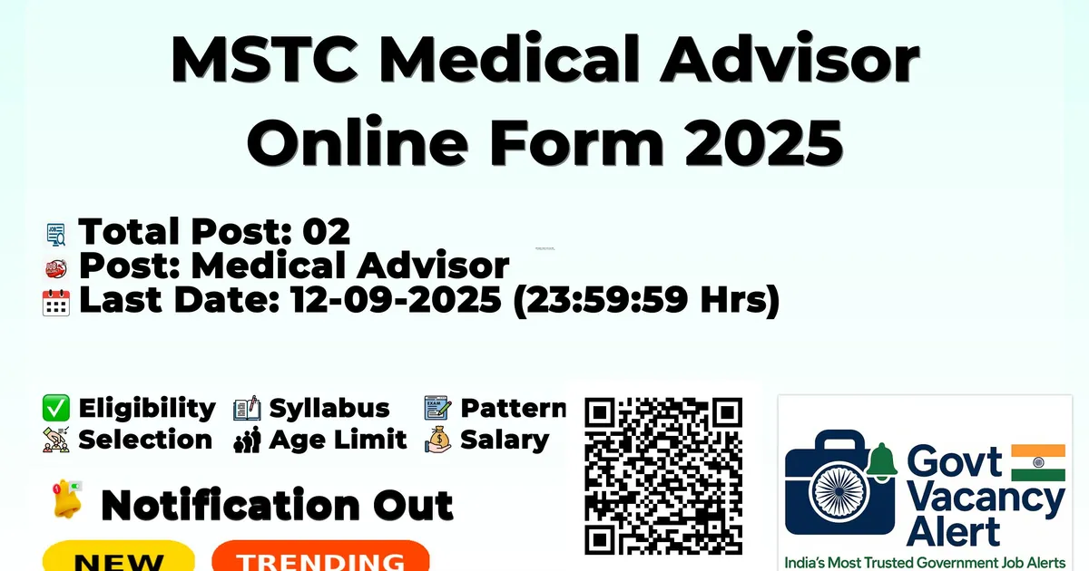 The Metal Scrap Trade Corporation (MSTC) Recruitment 2025 for 02 posts of Medical Advisor. Candidates with MBBS, MS/MD Can Apply Online. The online application opens on 29-09-2025, and closes on 12-09-2025. The candidate shall apply online through MSTC website, mstcindia.co.in.