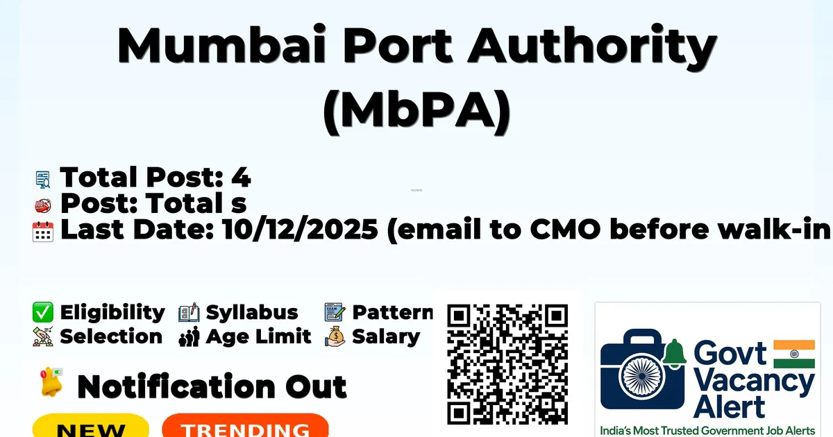 Mumbai Port Authority has released an official notification for the recruitment of 04 Medical Officer Posts. Interested and eligible candidates can apply Offline through the official Mumbai Port Authority website. The last date to submit the application form is 10-12-2025. In this article, you’ll find the Mumbai Port Authority Medical Officer Posts recruitment details, including eligibility criteria, age limit, salary structure, selection process, application steps, and direct links to the official notification and Offline application form.