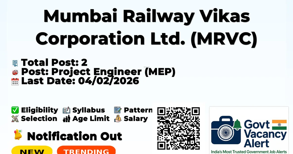 Company Name Mumbai Railway Vikas Corporation Ltd. (MRVC) Post Name Project Engineer (MEP) No of Posts 2 Salary Rs.40,000-1,40,000 Qualification BE/B.Tech Age Limit 30 years Last Date for Apply 04/02/2026 Official Website www.mrvc.indianrailways.gov.in