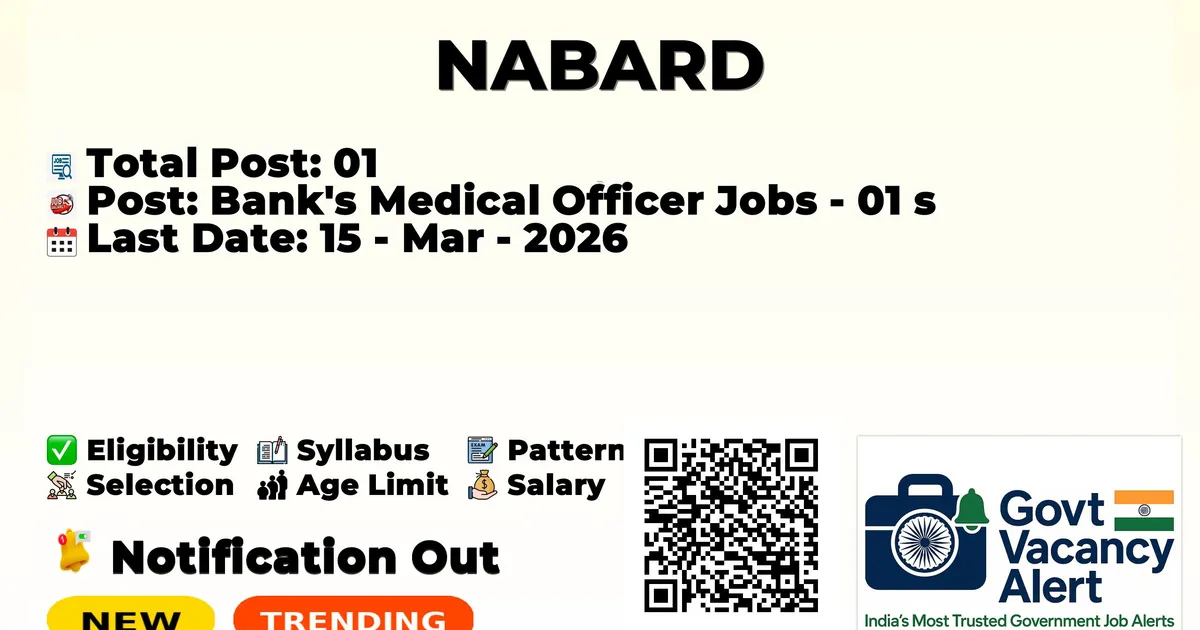 National Bank for Agriculture and Rural Development (NABARD) has released an official notification for the recruitment of the Bank’s Medical Officer Posts. Those candidates who have completed their MBBS can grab this chance and apply for the NABARD Recruitment 2026. Here, we included the age limit, selection process, salary structure, education details, application fee, and how to apply for these posts. Interested and eligible candidates can apply before the last date of application.