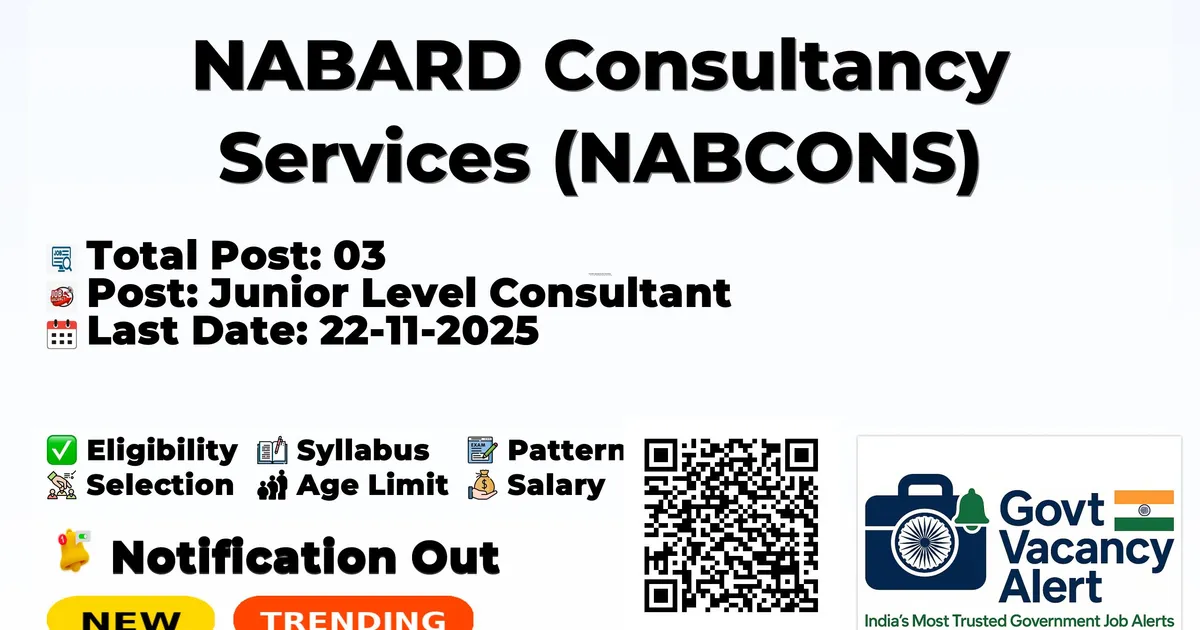 NABARD Consultancy Services (NABCONS) has released an official notification for the recruitment of 03 Junior Level Consultant Posts. Interested and eligible candidates can apply Online through the official NABCONS website. The last date to submit the application form is 22-11-2025. In this article, you’ll find the NABCONS Junior Level Consultant Posts recruitment details, including eligibility criteria, age limit, salary structure, selection process, application steps, and direct links to the official notification and Online application form.