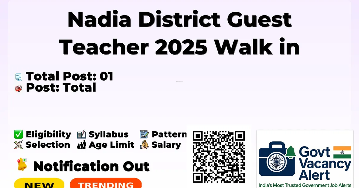 Nadia District Recruitment 2025 for 01 posts of Guest Teacher. Candidates with B.Ed, Any Post Graduate Can attend the walkin. The Walk-in on 25-11-2025. For detailed information please visit Nadia District official website, nadia.gov.in.