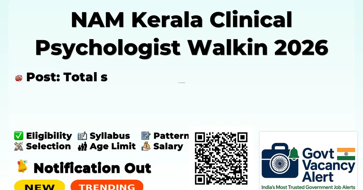 Organization Name National Ayush Mission Kerala (NAM Kerala) Post Name Clinical Psychologist Number of Posts 1 State Kerala Walk-in Date 17 February 2026 Apply Mode Walk-in Interview Field Healthcare