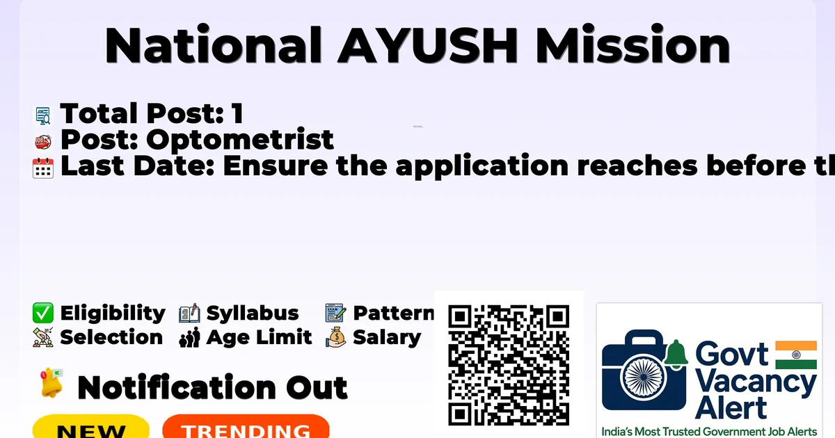 National AYUSH Mission (NAM Kerala) has released an official notification for the recruitment Optometrist Posts. Interested and eligible candidates can apply Offline through the official NAM Kerala website. The last date to submit the application form is 25-02-2026. In this article, you’ll find the NAM Kerala Optometrist Posts recruitment details, including eligibility criteria, age limit, salary structure, selection process, application steps, and direct links to the official notification and Offline application form.