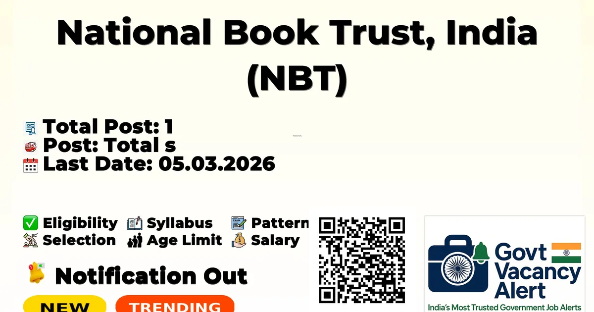 Interested candidates who fulfill the minimum eligibility criteria may apply to the Deputy Director (A&E), National Book Trust, India, 5, Institutional Area, Phase-II, Vasant Kunj, New Delhi - 110070 in the prescribed format available on the website www.nbtindia.gov.in. Self-attested copies of all relevant certificates, degrees, testimonials etc. should be attached. Originals must be produced at the time of interview and joining if selected. No TA/DA will be paid for attending the Interview. Last date for submission of applications is 05/03/2026.