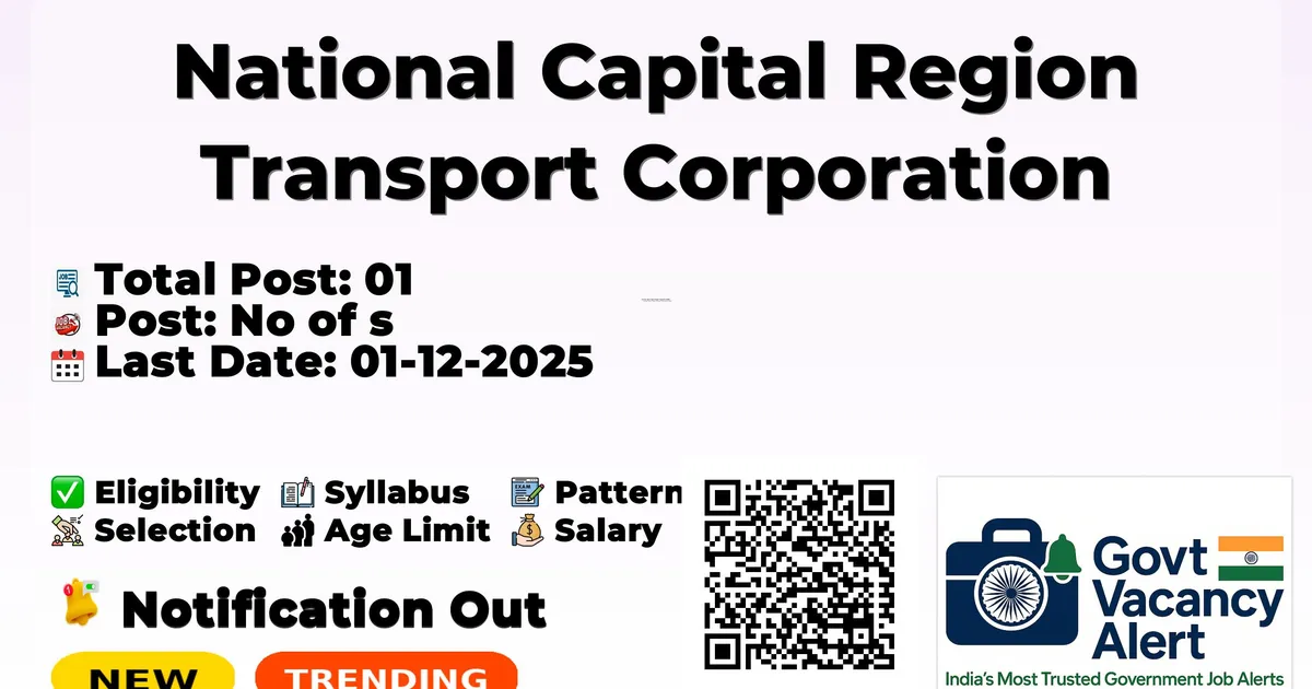Company Name National Capital Region Transport Corporation (NCRTC) Post Name Chief Engineer No of Posts 01 Pay Matrix Rs.1,59,348 Qualification B.Tech/ B.E Age Limit 65 years Start Date for Apply Online 01-11-2025 Last Date for Apply Online 01-12-2025 Official Website ncrtc.co.in