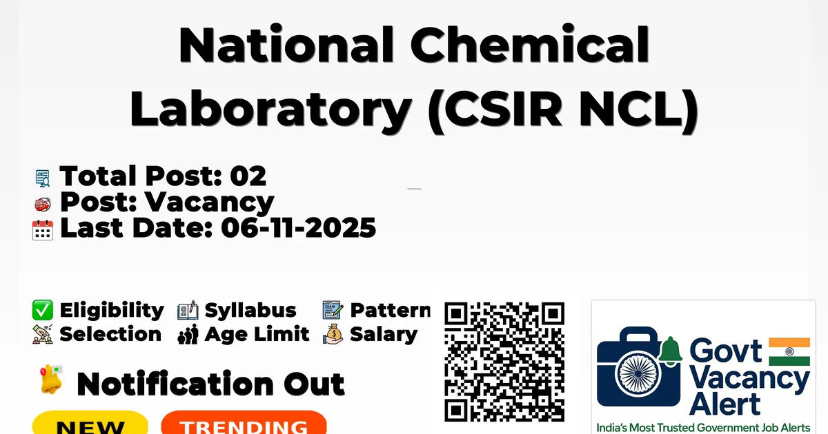 National Chemical Laboratory (CSIR NCL) has released an official notification for the recruitment of 02 Project Associate Posts. Interested and eligible candidates can apply Online through the official CSIR NCL website. The last date to submit the application form is 06-11-2025. In this article, you’ll find the CSIR NCL Project Associate Posts recruitment details, including eligibility criteria, age limit, salary structure, selection process, application steps, and direct links to the official notification and Online application form.
