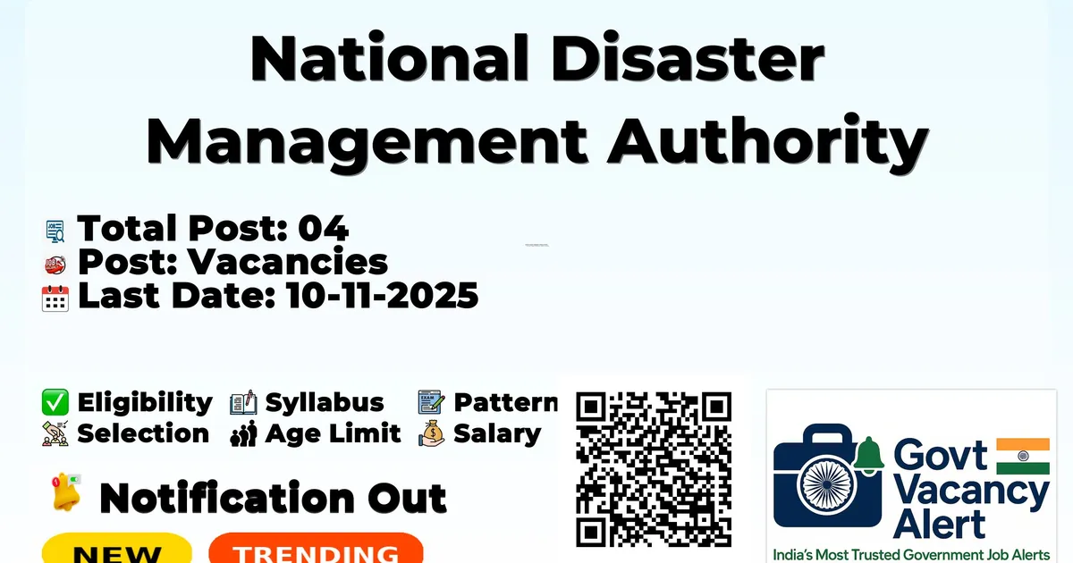 Company Name National Disaster Management Authority (NDMA) Post Name Consultant No of Posts 04 Pay Matrix Rs. 35000-100000 Qualification M.A, MBA/PGDM Start Date for Apply Online 04-11-2025 Last Date for Apply Online 10-11-2025 Official Website ndma.gov.in