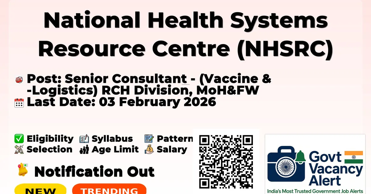 Company Name National Health Systems Resource Centre (NHSRC) Post Name Senior Consultant - (Vaccine & Logistics) RCH Division, MoH&FW Salary Between Rs.90,000/- to Rs.1,50,000/- per month as per experience and qualification Qualification Post Graduate Diploma in Management (PGDM) or MBA (Hospital Management/ Healthcare Management / Hospital & Healthcare Management/ Operations/ Supply Chain/ Logistics Management/ Material/ Material Management/ Industrial Supply Chain/Human Resources) or Master of Public Health (MPH) Age Limit Up to 55 years Last Date 03 February 2026 Official Website http://nhsrcindia.org