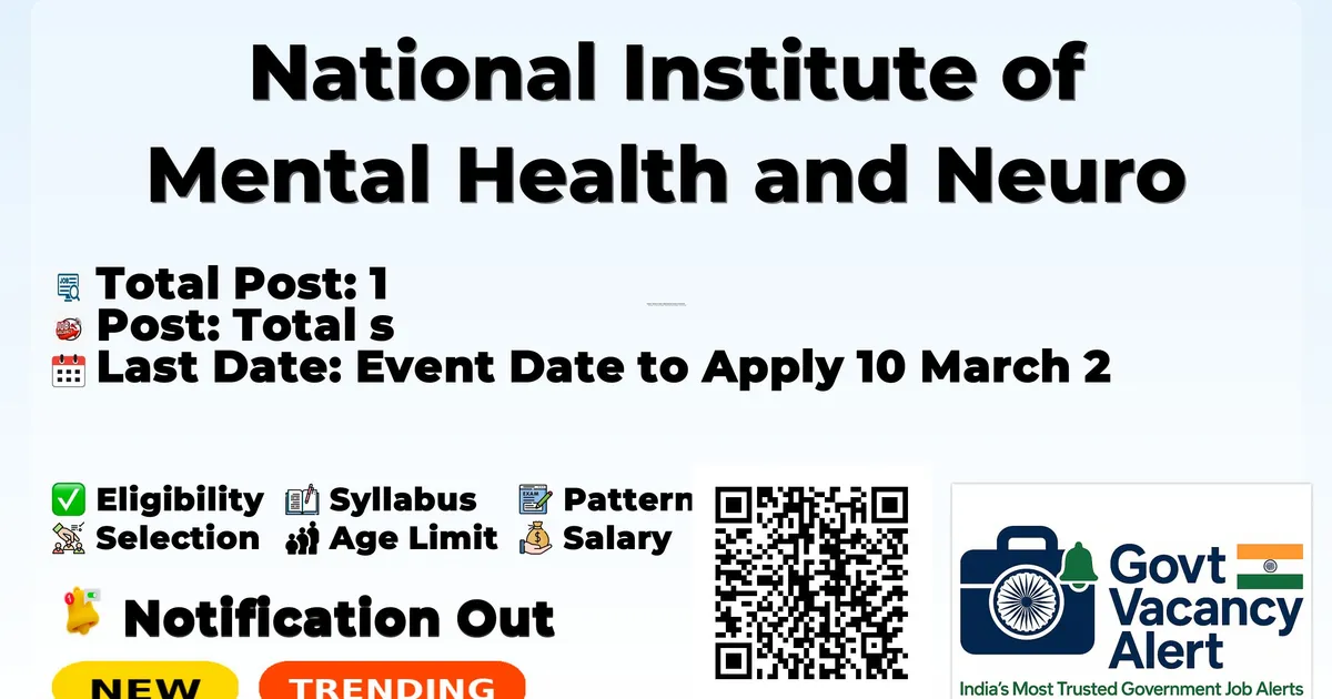 National Institute of Mental Health and Neuro Sciences (NIMHANS) has released an official notification for Walk-in Interview for 1 Project Technical Support - III Posts. Eligible candidates can attend the Walk-in Interview on 10-03-2026 at the NIMHANS office with original documents and self-attested copies. Advertisement Company Name National Institute of Mental Health and Neuro Sciences (NIMHANS) Post Name Project Technical Support - III No of Posts 1 Salary Rs. 28,000/- + 30% HRA Per Month Qualification Graduate degree in Public Health/Psychology/Social Work Age Limit Maximum Age Limit: 35 years Walk-in Date 10 March 2026 Apply Mode Walk-in Job Type Contract Trending Govt Jobs RRB 22000 Group D Online form 2026 IAF Agniveer New Recruitment 2026 DSSSB 911 AE, JE & More Online Form 2026 MCL 677 Various Vacancies Online Form 2026 MMRDA 235 AE, JE and More Posts Online Form 2026 Candidates should download and read the NIMHANS Jobs 2026 notification PDF carefully to check vacancy details, eligibility, age limit, and application instructions. The notification also includes important dates and selection process details. The direct download link is available in the Important Links section below. Download NIMHANS Project Technical Support - III Job 2026 Notification PDF Post Name Total Posts Project Technical Support - III 1 Total 1 Graduate degree in Public Health/Psychology/Social Work Experience in the area of mental health Experience of working in projects/programs at State level Ability to fluently read, write and speak in Kannada and two of Hindi or Telugu or Tamil Undertaken mental health related field-based data collection Maximum Age Limit: 35 years Rs. 28,000/- + 30% HRA Per Month Event Date Last Date to Apply 10 March 2026 Written Test/Interview Skill Test/Interview Minimum 50% in written examination required to qualify for skill test/interview For Direct Interview minimum 50% Marks in the interview required Candidates who wish to attend the walk-in interview for NIMHANS Project Technical Support - III Recruitment 2026 should follow the steps below. Read the official notification carefully before attending the interview. Candidates must report at the venue as per the reporting time mentioned in the notification. Carry all original documents along with one set of self-attested photocopies such as ID proof, educational certificates, experience certificates (if required), and category certificate (if applicable). Bring the duly filled application form if required in the notification. Verify eligibility criteria before attending the interview. Candidates are advised to reach the venue well in advance to complete registration formalities. Keep extra passport-size photographs for submission if required. Official Notification PDF Click here Official Website Click here