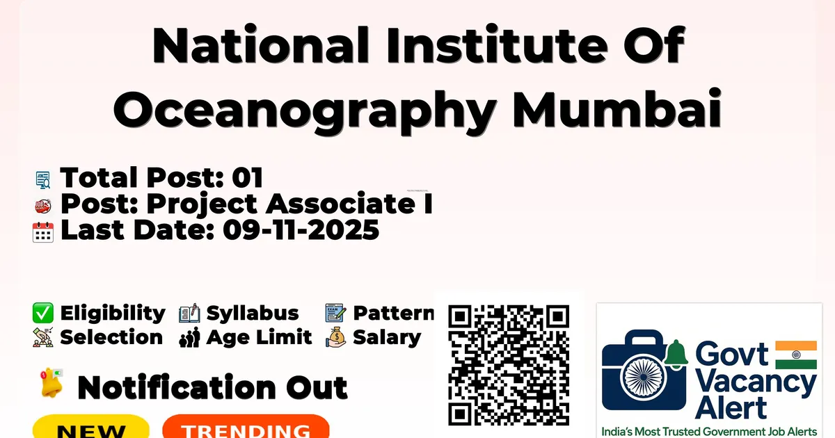 National Institute Of Oceanography Mumbai (NIO Mumbai) has released an official notification for the recruitment of 01 Project Associate I Posts. Interested and eligible candidates can apply Online through the official NIO Mumbai website. The last date to submit the application form is 09-11-2025. In this article, you’ll find the NIO Mumbai Project Associate I Posts recruitment details, including eligibility criteria, age limit, salary structure, selection process, application steps, and direct links to the official notification and Online application form.