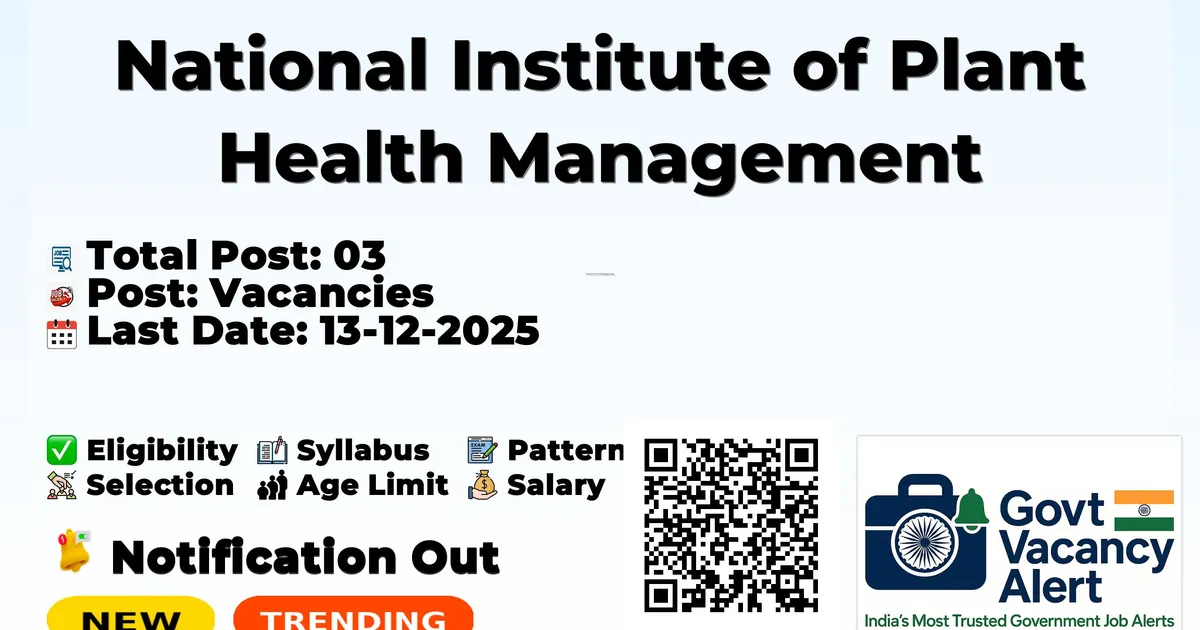 Company Name National Institute of Plant Health Management (NIPHM) Post Name Lab Attendant, Joint Director and More No of Posts 03 Salary Rs. 18,000-2,09,200 Qualification 10TH, M.Sc, M.Phil/Ph.D Age Limit 18 to 55 years Start Date for Apply 14-11-2025 Last Date for Apply 13-12-2025 Official Website niphm.gov.in