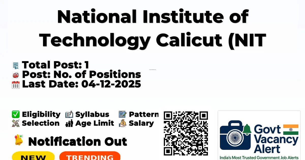 National Institute of Technology Calicut (NIT Calicut) has released an official notification for the recruitment of 01 Proiect Associate I Posts. Interested and eligible candidates can apply Offline through the official NIT Calicut website. The last date to submit the application form is 04-12-2025. In this article, you’ll find the NIT Calicut Proiect Associate I Posts recruitment details, including eligibility criteria, age limit, salary structure, selection process, application steps, and direct links to the official notification and Offline application form.