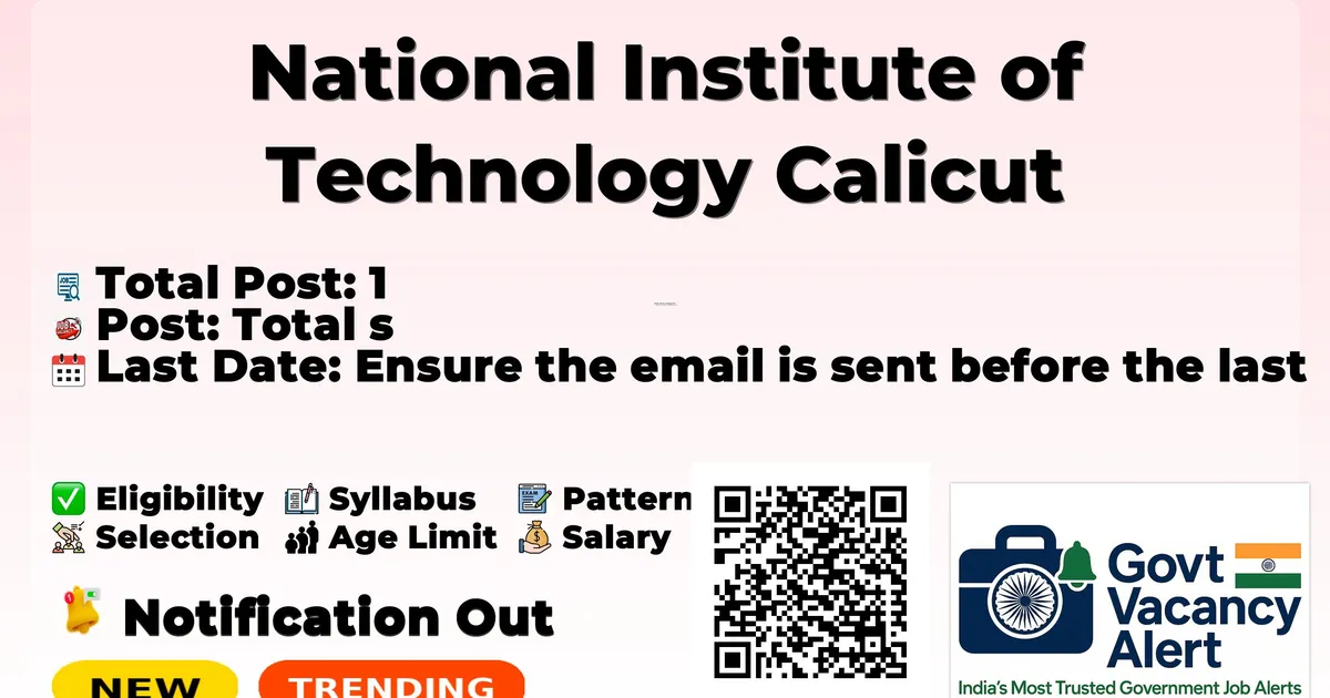 National Institute of Technology Calicut (NIT Calicut) Recruitment 2026: National Institute of Technology Calicut has released the official notification for 1 Junior Research Fellow (JRF) posts, inviting applications from eligible candidates. This recruitment provides an excellent opportunity for candidates seeking research jobs.Candidates can apply by sending their complete application along with required documents via email. The last date to submit the email application is 23-03-2026. Below, you can find complete details of Junior Research Fellow (JRF) Recruitment 2026, including vacancy breakdown, eligibility, age limit, salary, selection process, application procedure, and important links. Advertisement Company Name National Institute of Technology Calicut Post Name Junior Research Fellow No of Posts 1 Advt No JRF/ARMREB/MAA/2025/329 Salary Rs. 37,000/- per month + 20% HRA Qualification BTech or BE Or Post Graduate Degree Age Limit 35 years Last Date 23-03-2026 Apply Mode Email Job Type Contract Candidates who are interested in applying for the NIT Calicut Recruitment 2026 should first download and carefully read the official notification PDF. The notification contains complete details about vacancy distribution, eligibility criteria, age limit, stipend/salary, selection process, important dates, and application instructions. Reading the official document is important to ensure that you meet all requirements before submitting the application form. Download NIT Calicut Junior Research Fellow (JRF) Job 2026 Notification PDF Post Name Total Posts Junior Research Fellow 1 Total 1 Trending Govt Jobs RRB 22000 Group D Online form 2026 Indian Army Agniveer Recruitment Rally Notification 2026 AIIMS NORCET 10 Online Form 2026 HPCL 731 Engineers, JEA and More Online Form 2026 RBI 650 Assistant Online Form 2026 BTech or BE in Mechanical Engineering / Production Engineering / Metallurgical and Materials Engineering or Equivalent Post Graduate Degree in Design / Manufacturing / Metallurgical and Materials or related fields GATE or NET qualification mandatory Desirable: Knowledge in high temperature deformation of materials and materials characterization (SEM and EBSD) Strong programming skills in MATLAB or Python No application fee is mentioned in the official notification. Junior Research Fellow: Maximum age limit is 35 years. Consolidated Monthly Pay: Rs. 37,000/- HRA: 20% of basic pay Event Date Last Date for Application Submission 23 March 2026 Interview Date 27 March 2026 Online Interview Candidates who wish to apply for NIT Calicut Junior Research Fellow (JRF) Recruitment 2026 via email should follow the steps below. Read the official notification carefully before applying. Prepare your application with complete bio-data including personal details, educational qualifications, and experience. Attach self-attested copies of all required documents such as educational certificates, experience certificates, ID proof, and recent passport-size photographs. Clearly mention the post applied for in the subject line of the email. Send the complete application to the official email address mentioned in the notification. Ensure the email is sent before the last date: 23-03-2026. Keep a copy of the sent email for future reference. Link Description Link Official Notification PDF Click here Official Website Click here