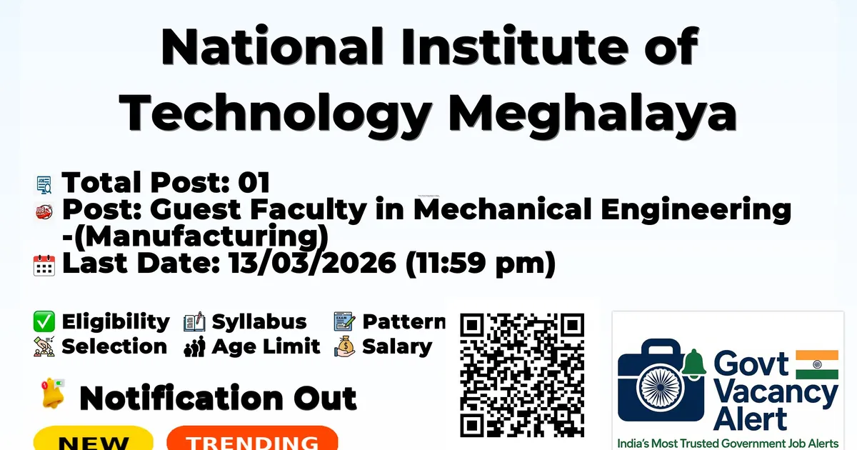 National Institute of Technology Meghalaya (NIT Meghalaya) has released an official notification for the recruitment of 01 Guest Faculty Posts. Interested and eligible candidates can apply Online through the official NIT Meghalaya website. The last date to submit the application form is 13-03-2026. In this article, you’ll find the NIT Meghalaya Guest Faculty Posts recruitment details, including eligibility criteria, age limit, salary structure, selection process, application steps, and direct links to the official notification and Online application form.