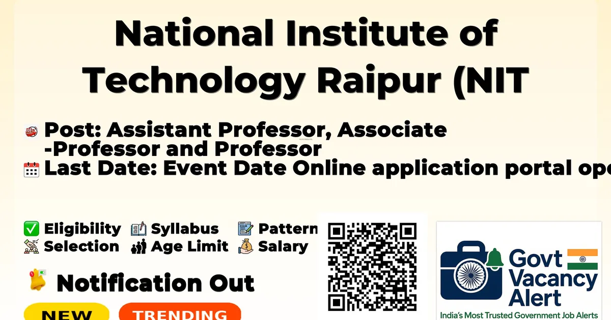 Company Name National Institute of Technology Raipur (NIT Raipur) Post Name Assistant Professor, Associate Professor and Professor Start Date 15 January 2026 Last Date 17 February 2026 Official Website http://www.nitr.ac.in