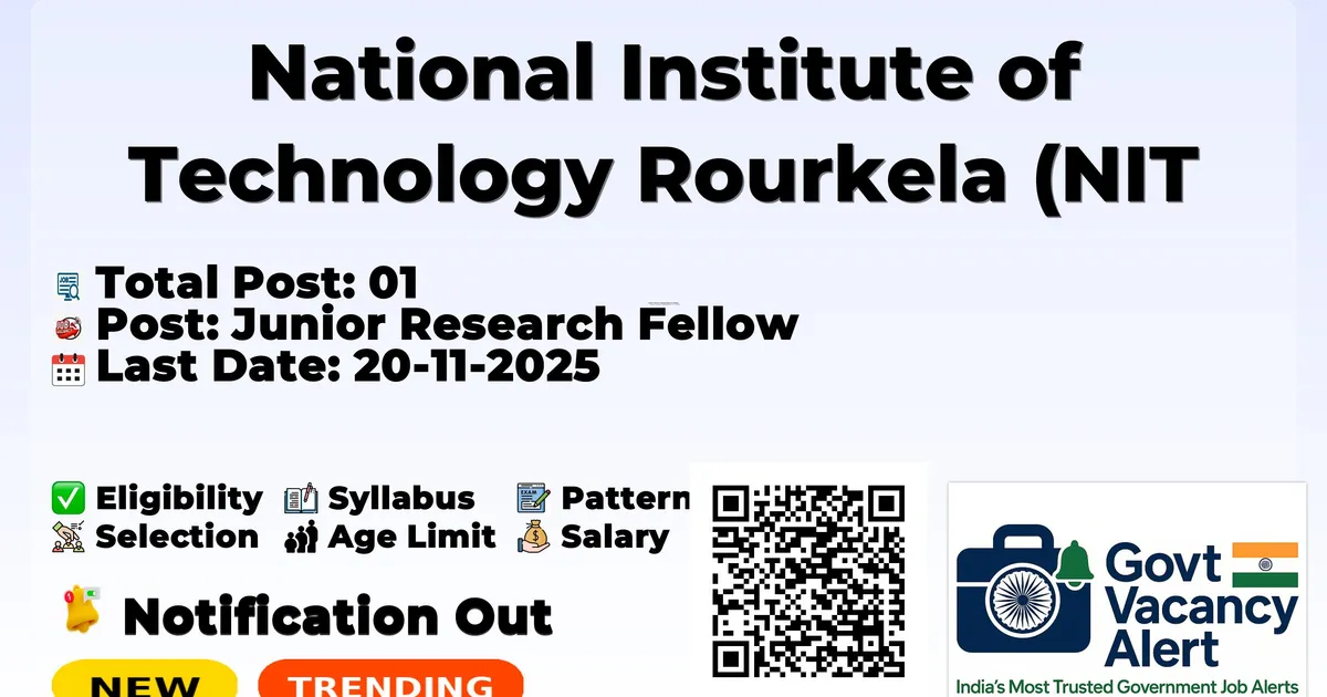 National Institute of Technology Rourkela (NIT Rourkela) has released an official notification for the recruitment of 01 Junior Research Fellow Posts. Interested and eligible candidates can apply Offline through the official NIT Rourkela website. The last date to submit the application form is 20-11-2025. In this article, you’ll find the NIT Rourkela Junior Research Fellow Posts recruitment details, including eligibility criteria, age limit, salary structure, selection process, application steps, and direct links to the official notification and Offline application form.