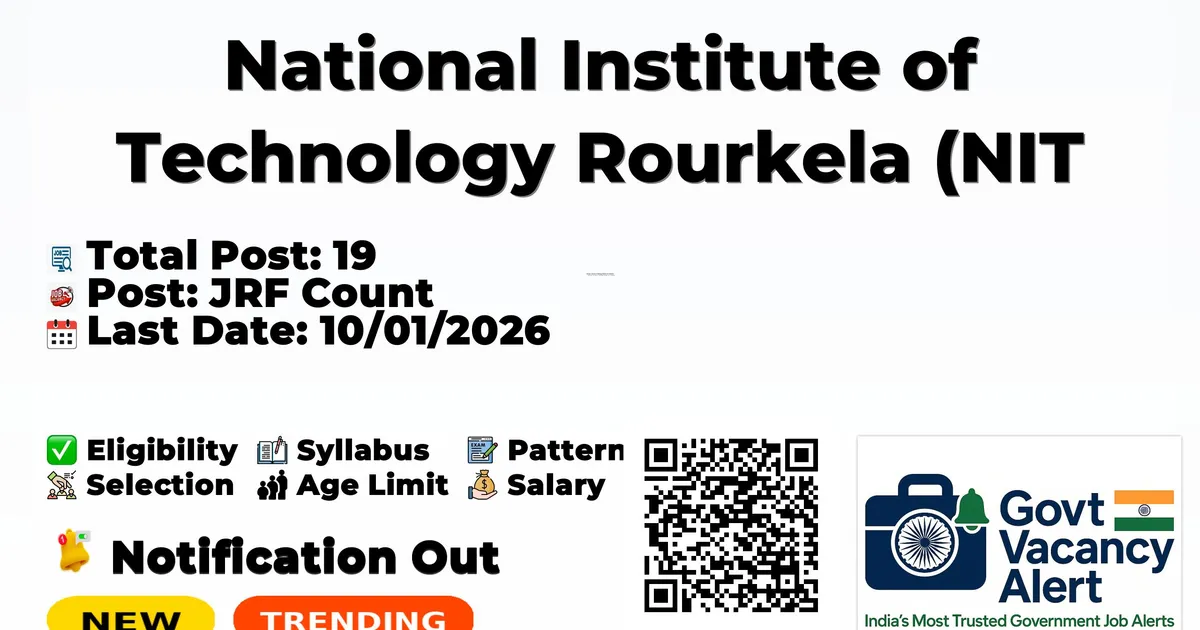 National Institute of Technology Rourkela (NIT Rourkela) has released an official notification for the recruitment of 19 Junior Research Fellow Posts. Interested and eligible candidates can apply Online through the official NIT Rourkela website. The last date to submit the application form is 10-01-2026. In this article, you’ll find the NIT Rourkela Junior Research Fellow Posts recruitment details, including eligibility criteria, age limit, salary structure, selection process, application steps, and direct links to the official notification and Online application form.