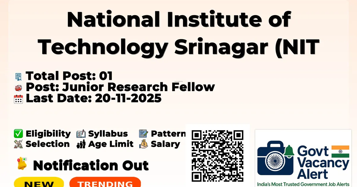 National Institute of Technology Srinagar (NIT Srinagar) has released an official notification for the recruitment of 01 Junior Research Fellow Posts. Interested and eligible candidates can apply Offline through the official NIT Srinagar website. The last date to submit the application form is 20-11-2025. In this article, you’ll find the NIT Srinagar Junior Research Fellow Posts recruitment details, including eligibility criteria, age limit, salary structure, selection process, application steps, and direct links to the official notification and Offline application form.