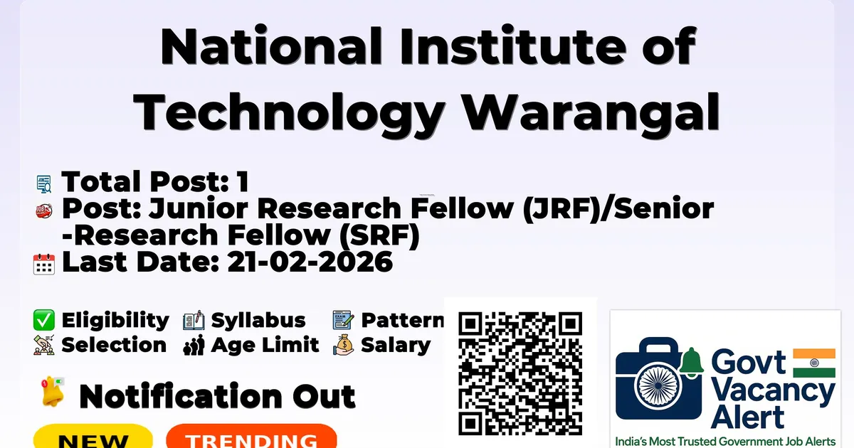 National Institute of Technology Warangal (NIT Warangal) has released an official notification for the recruitment of 01 Junior Research Fellow / Senior Research Fellow Posts. Interested and eligible candidates can apply Online through the official NIT Warangal website. The last date to submit the application form is 21-02-2026. In this article, you’ll find the NIT Warangal Junior Research Fellow / Senior Research Fellow Posts recruitment details, including eligibility criteria, age limit, salary structure, selection process, application steps, and direct links to the official notification and Online application form.