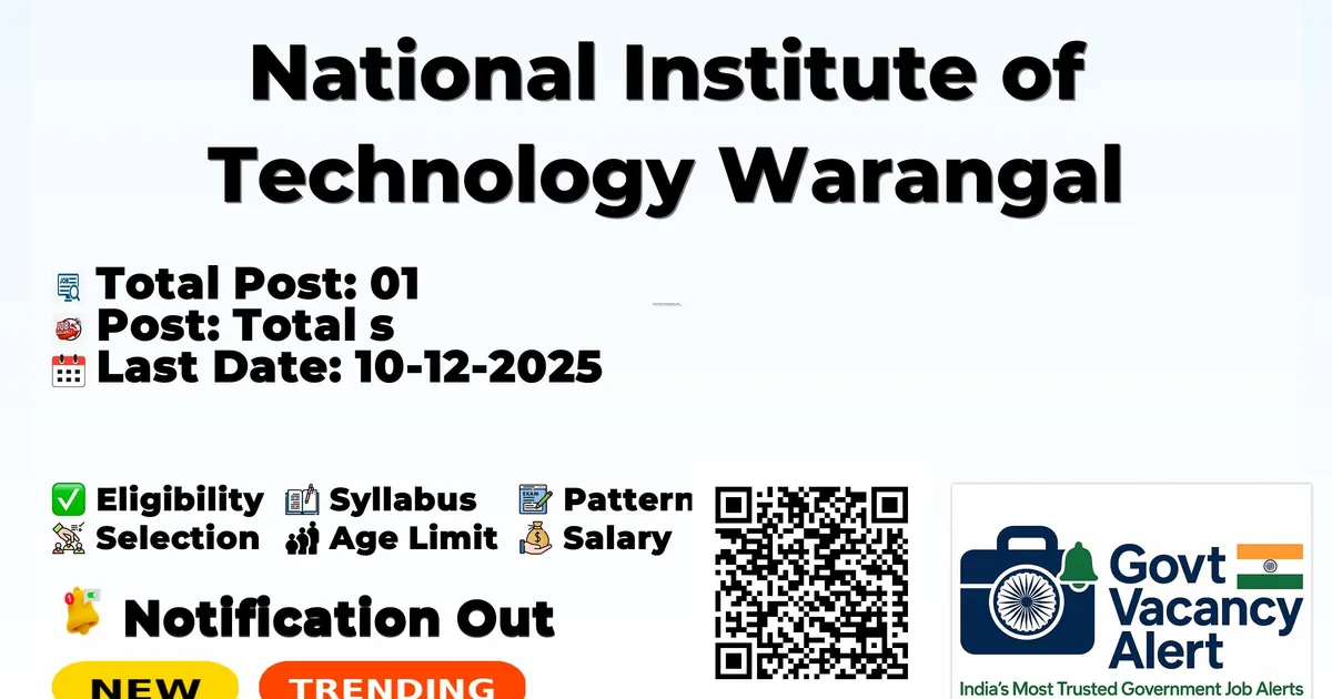 National Institute of Technology Warangal (NIT Warangal) has released an official notification for the recruitment of 01 Junior Research Fellow Posts. Interested and eligible candidates can apply Offline through the official NIT Warangal website. The last date to submit the application form is 10-12-2025. In this article, you’ll find the NIT Warangal Junior Research Fellow Posts recruitment details, including eligibility criteria, age limit, salary structure, selection process, application steps, and direct links to the official notification and Offline application form.