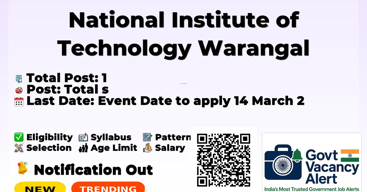 National Institute of Technology Warangal (NIT Warangal) has released an official notification for the recruitment of 1 Junior Research Fellow (JRF) Posts. Interested and eligible candidates can apply Online through the official NIT Warangal website. The last date to submit the application form is 14-03-2026.