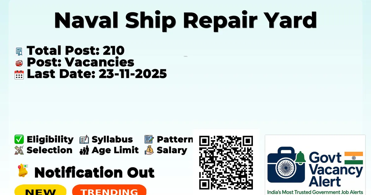 Company Name Naval Ship Repair Yard Post Name Apprentice No of Posts 210 Pay Matrix Rs. 3400-9600 Qualification ITI, 10TH, 8TH Age Limit 14 to 18 years Start Date for Apply 24-10-2025 Last Date for Apply 23-11-2025 Official Website indiannavy.nic.in