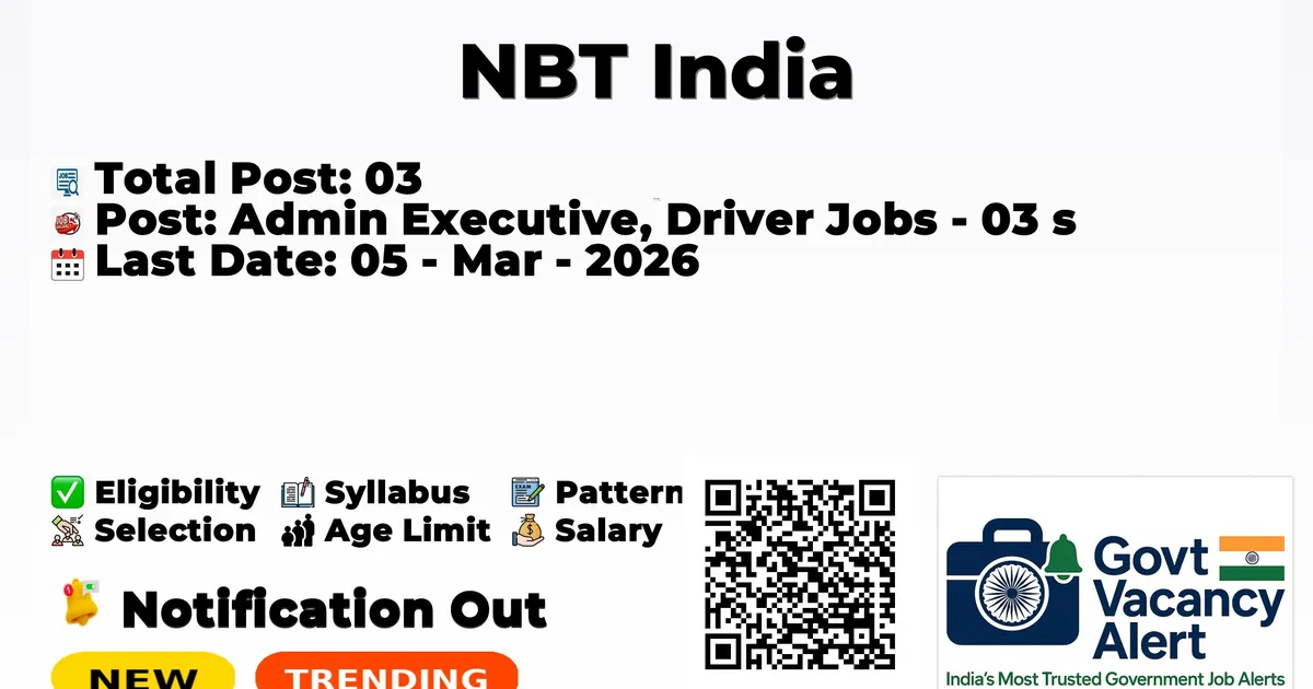 The National Book Trust, India (NBT India) has officially released the notification to fill the vacancies of 03 Admin Executive and Driver Jobs. Interested and eligibile candidates can use this opportunity to apply for these posts before the last date of application. Candidates who have completed their Any Degree, 10th, can apply for the NBT India Notification 2026. The interested applicants can apply in offline mode. Here we have mentioned the education details, age limit, selection process, application fee, salary, and how to apply for these posts before the deadline. The application dates have already begun.