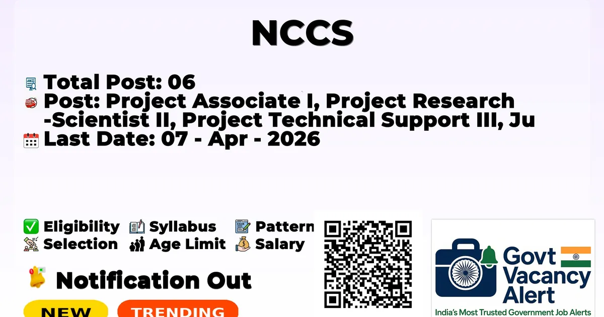 The National Centre for Cell Science (NCCS) has officially released the notification to fill the vacancies of 06 Project Associate I, Project Research Scientist II, Project Technical Support III, and Junior Research Fellow Jobs. Interested and eligibile candidates can use this opportunity to apply for these posts before the last date of application. Candidates who have completed their B.E./B. Tech, B. Pharm, Any Degree, Post-graduation, Ph.D., can apply for the NCCS Notification 2026. The interested applicants can attend the walk-in interview. Here we have mentioned the education details, age limit, selection process, application fee, salary, and how to apply for these posts before the deadline. The application dates have already begun.